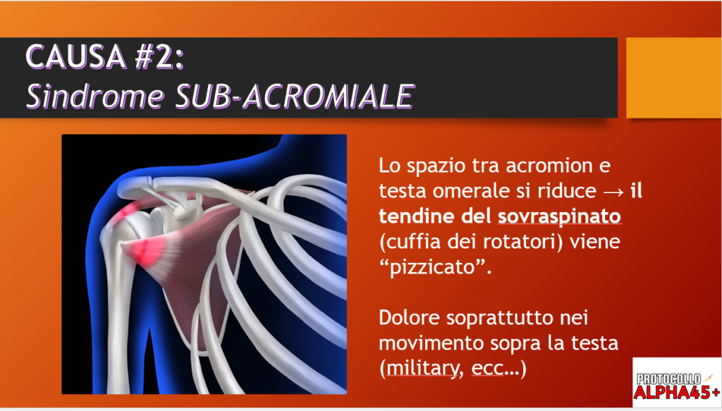 Il tendine del sovraspinato viene “schiacciato” sotto l’acromion durante i movimenti sopra la testa. Risultato: dolore acuto durante military press e alzate laterali.