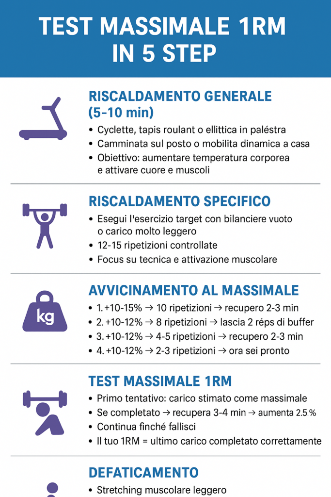 È una delle domande più frequenti tra chi inizia un programma di allenamento serio. La risposta passa dal test massimale 1RM (One Repetition Maximum): il carico massimo che puoi sollevare per una sola ripetizione, mantenendo tecnica corretta.